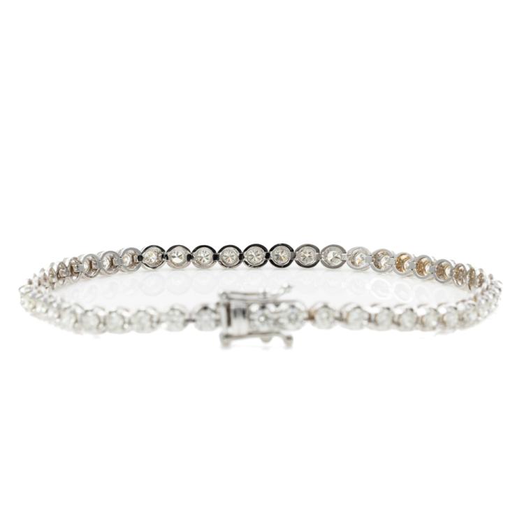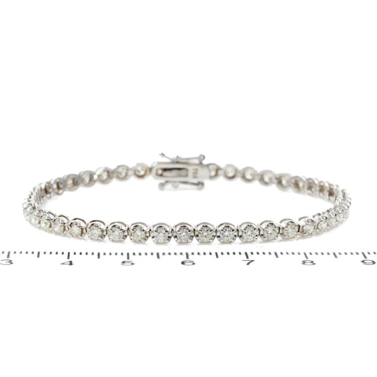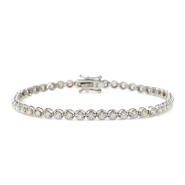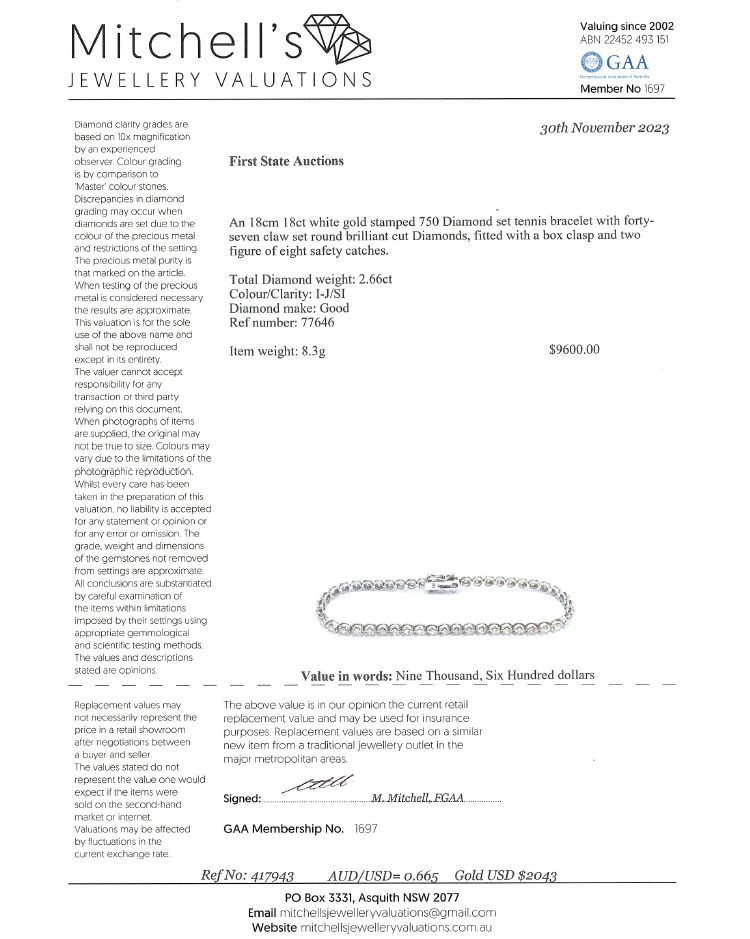 Diamond tennis bracelet with 47 round brilliant cut Natural Diamonds totalling 2.66cts. (Estimated grading: I-J SI). 18ct white gold. Length: 18cm. Weight: 8.3g. With Valuation Certificate #417943. (New)