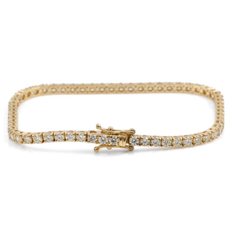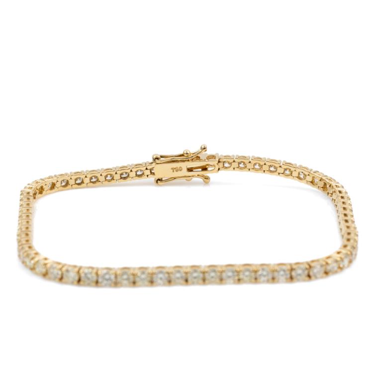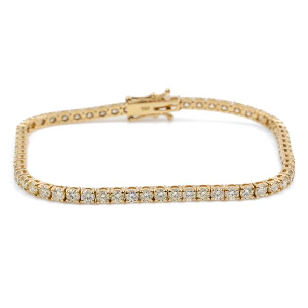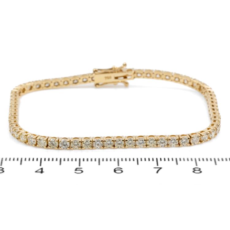 Diamond tennis bracelet with 62 round brilliant cut Natural Diamonds totalling 5.22cts. (Estimated grading: J-K SI). 18ct yellow gold. Length: 18cm. Weight: 9.7g. With Valuation Certificate #418007. (New)