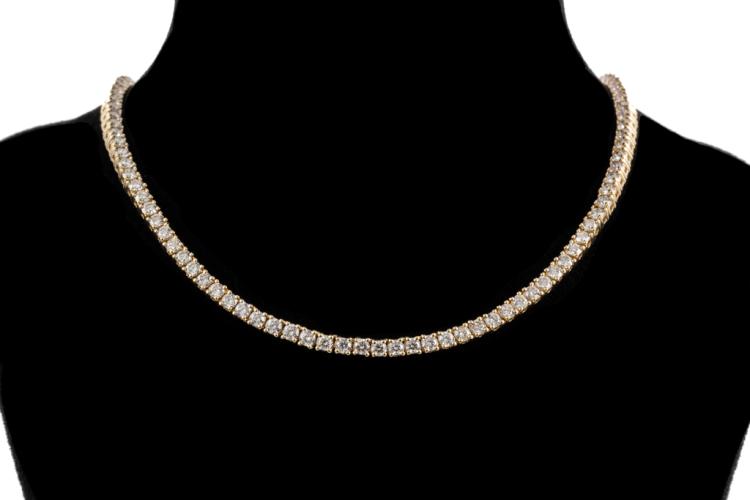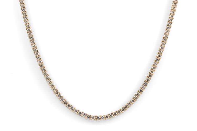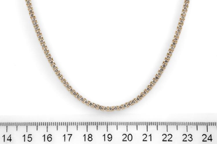 Diamond tennis necklace with 177 round Natural Diamonds totalling 7.48cts (Estimated grading: H-I SI-P1). 14ct yellow gold. Length: 42cm. Weight: 15.3g. With Valuation Certificate #417779. (New)