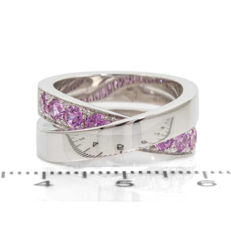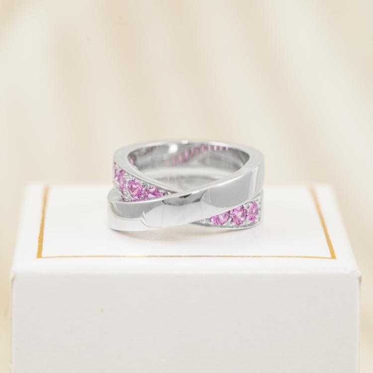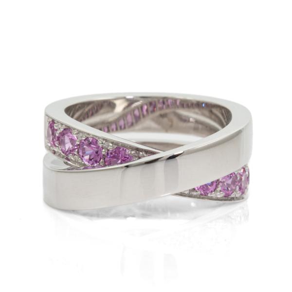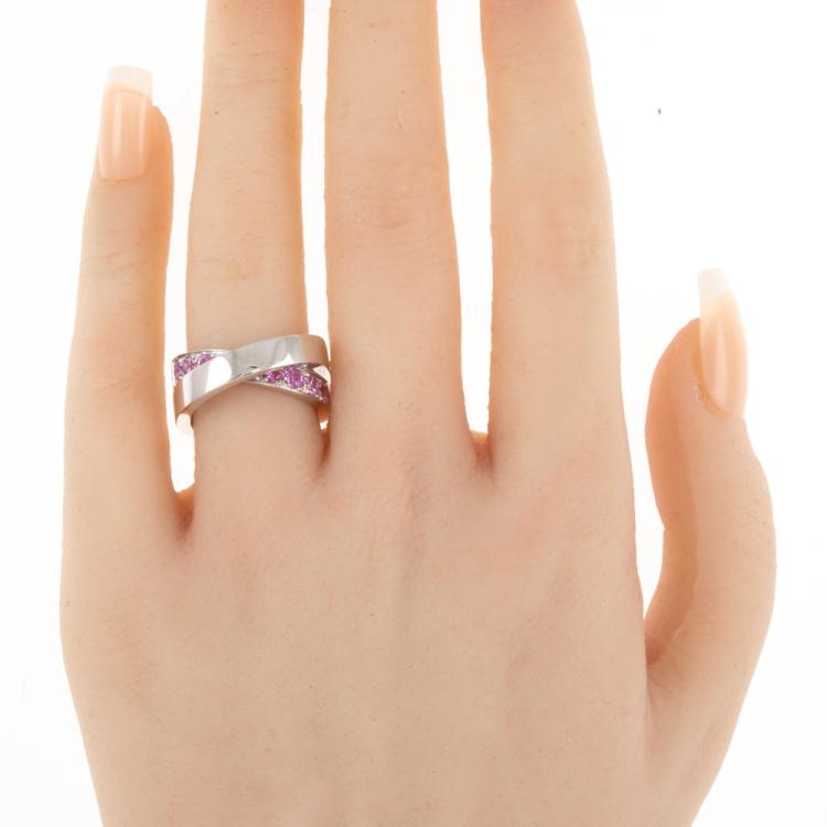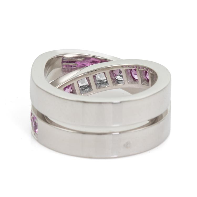 Cartier Paris Nouvelle Vague crossover ring with 11 round pink Natural Sapphires totalling approximately 1.00cts. 18ct white gold. Band width: 8.9mm. Cartier stamped size 51, L - ring resizing is not recommended. Weight: 14.7g. (Pre-owned)