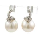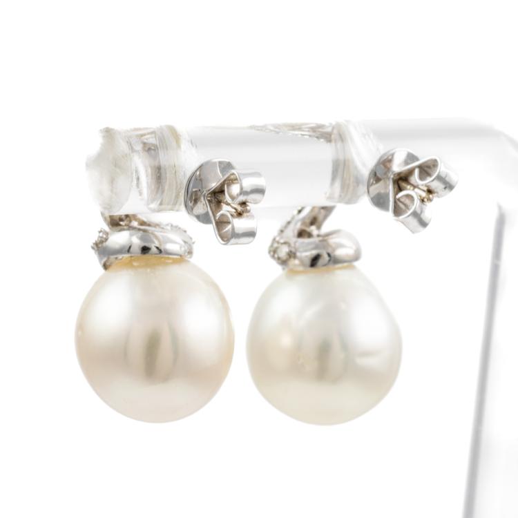 Pearl and Diamond earrings with off round South Sea Pearls of 11mm and round Natural Diamonds totalling 0.20cts. 18ct white gold (note posts slightly bent). Weight: 6.5g. (Pre-owned)