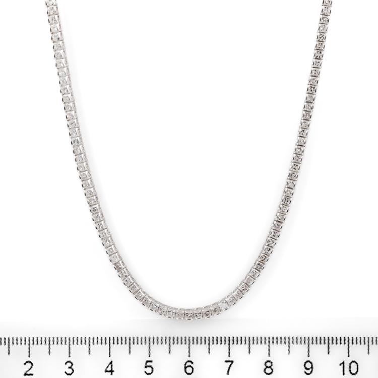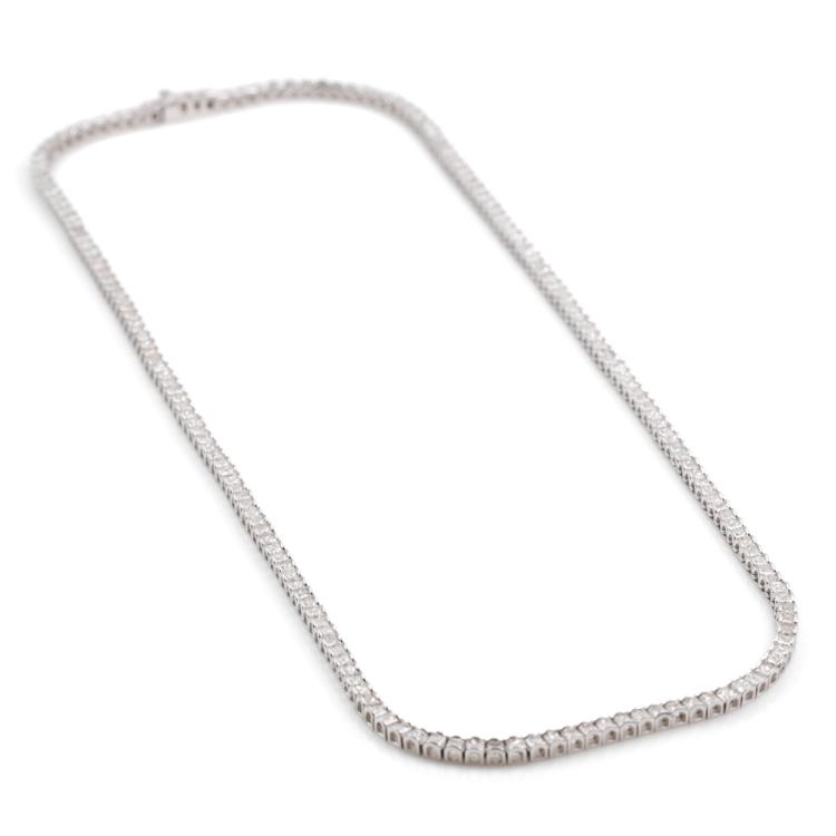 Diamond tennis necklace with princess cut Natural Diamonds totalling 8.00cts (Estimated grading: G-H VS). 18ct white gold. Length: 42cm. Weight: 15.7g. With Valuation Certificate #418173. (Pre-owned)