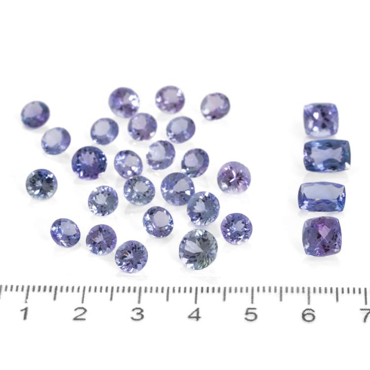 A Loose parcel of 24 round natural Tanzanites totalling 21.2ct and 4 cushion cut natural Tanzanites totalling 7.90ct. Size of round Tanzanites: 7.5 x 4.9mm - 5.9 x 3.1mm with Valuation Certificate #40764; size of cushion cut Tanzanites: 9.0 x 6.5 x 4.3mm - 6.9 x 6.7 x 5.1mm with Valuation Certificate #40765. (Pre-Owned)