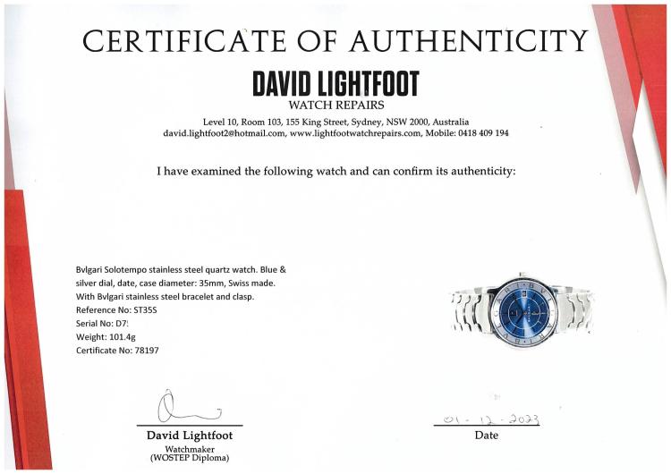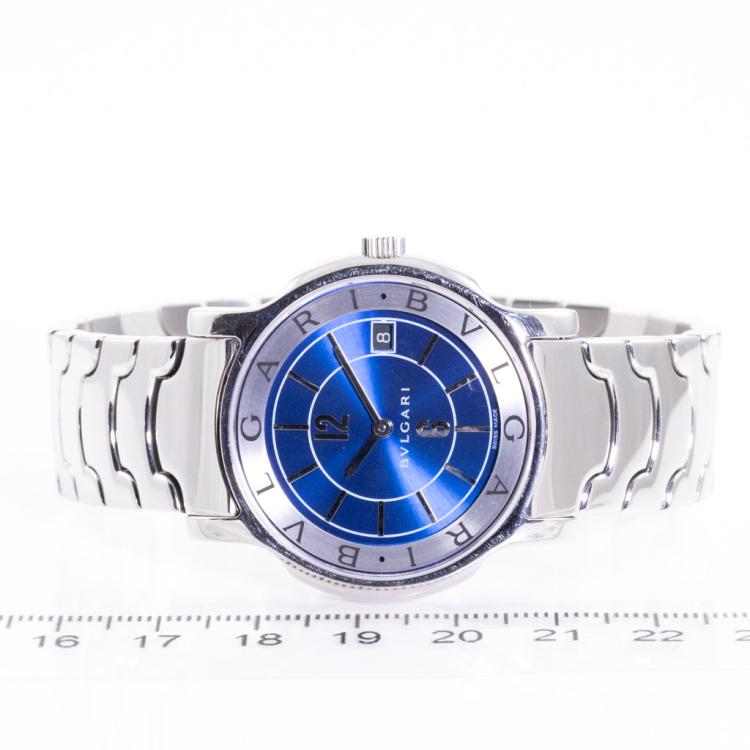 Bvlgari Solotempo stainless steel quartz watch. Blue & silver dial, date, case diameter: 35mm, wrist size: 16.5cm, Swiss made. Ref# ST35S. With Bvlgari stainless steel bracelet and clasp. With Certificate of Authenticity. 3 month FSA warranty. (Pre-owned)